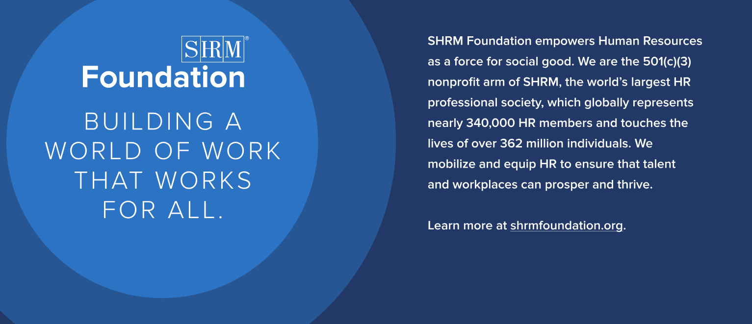 As SHRM’s nonprofit arm, the SHRM Foundation empowers HR and employers to address society’s most urgent workplace challenges. Through its programs and partnerships, the Foundation strengthens talent pipelines, supports mental health and wellness initiatives, and equips HR for the future. Help us build a world of work that works for everyone.